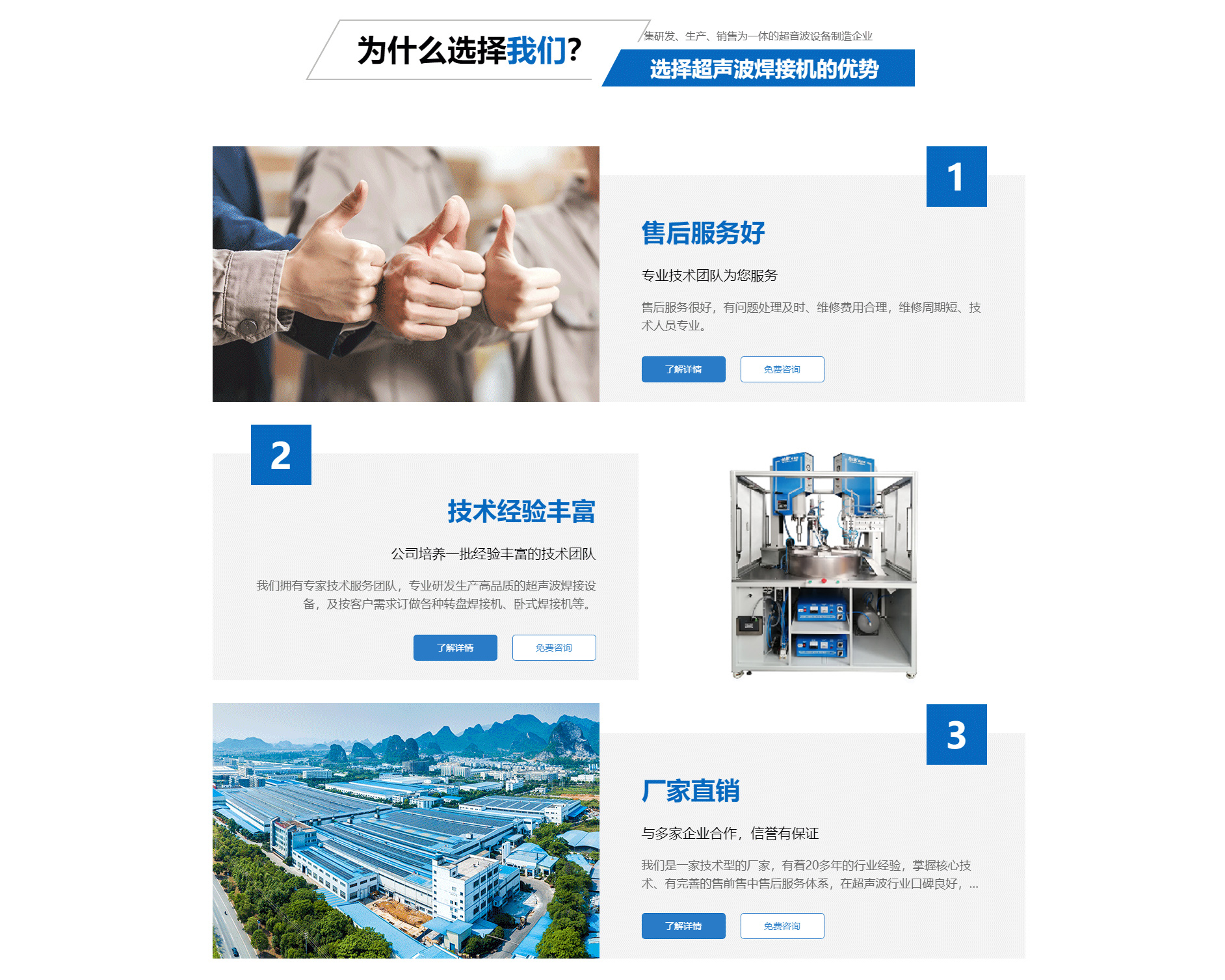 關(guān)于我們廈門(mén)勁榮機(jī)械設(shè)備有限公司是一家集研發(fā)、生產(chǎn)、銷(xiāo)售為一體的超音波設(shè)備制造企業(yè),主要產(chǎn)品包括多規(guī)格型號(hào)的超音波塑膠熔接機(jī)、熱板式塑料焊接機(jī)、多工位轉(zhuǎn)盤(pán)焊接機(jī)、振動(dòng)摩擦焊接機(jī)、旋轉(zhuǎn)式塑膠熔接機(jī)及配套的工裝夾具等。公司自2003年成立以來(lái),一直致力于產(chǎn)品不斷完善中,并追求產(chǎn)品的精益求精,于2004年向國(guó)家商標(biāo)局注冊(cè)了“勁榮”牌商標(biāo),2009年榮獲廈門(mén)市商標(biāo)。 經(jīng)過(guò)多年的努力,公司已經(jīng)發(fā)展成為占地面積2000余平方米、擁有員工50余人的企業(yè)。公司一直將“品質(zhì)是企業(yè)發(fā)展的原動(dòng)力”作為經(jīng)營(yíng)理念,嚴(yán)把質(zhì)量關(guān),建立了一整套有效的安全生產(chǎn)及管理模式,不僅贏得了同行的認(rèn)可,更取得了客戶的信賴,先后與九牧集團(tuán)、路達(dá)工業(yè)、建霖集團(tuán)、西伯電子、蒙發(fā)利實(shí)業(yè)、松霖科技、銥科集團(tuán)、科司特電子等公司建立了長(zhǎng)期的合作關(guān)系。 面對(duì)已經(jīng)取得的成績(jī),我們不驕不滿,因?yàn)樯钪獦I(yè)績(jī)只能代表過(guò)去,只有靠良好的產(chǎn)品質(zhì)量和完善的售后服務(wù)才能在客戶中口碑相傳,在...